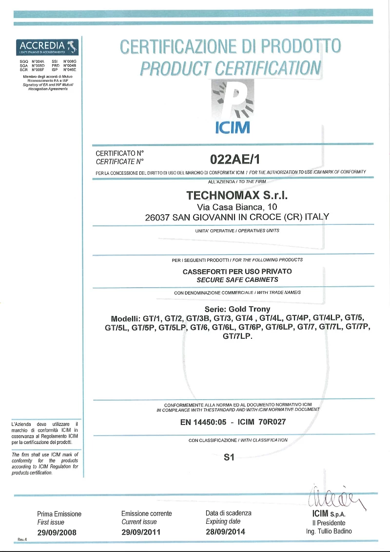 Сейфы серии Technomax отличаются превосходным качеством и известны своей надёжностью; об этом свидетельствуют европейский сертификат EN 1143-1 - GR.0, в домашних условиях предпочтительно держать в нём ценности на сумму не более трёх млн. рублей, и до восьмисот тысяч рублей – для юридических лиц.